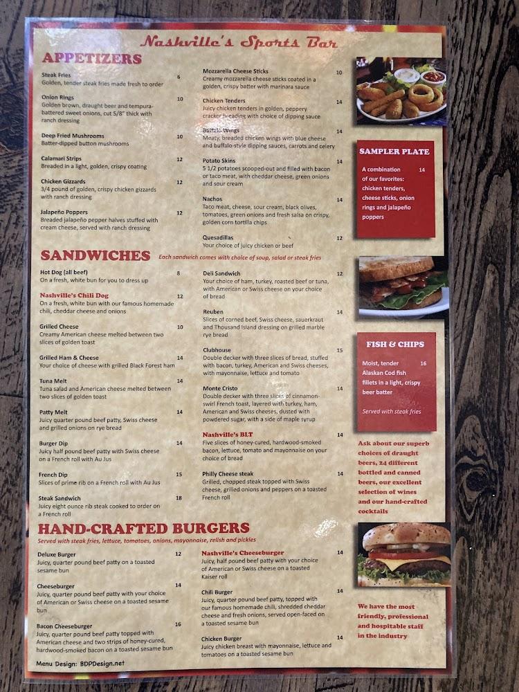 Nashville's menu features a wide array of options. Breakfast shines with choices like eggs any style or pancakes. Lunch and dinner offer classic burgers, sandwiches, and comfort food. An impressive selection of appetizers satisfies early cravings, with options like onion rings and deep-fried mushrooms.
