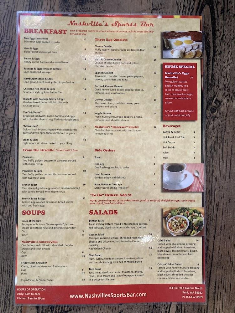 Welcome to Nashville's Sports Bar & Grill, your go-to destination for great food, drinks, and entertainment in Kent, WA. Nestled at 114 Railroad Ave N, we offer a lively atmosphere perfect for sports fans and karaoke enthusiasts alike. Enjoy our diverse menu featuring traditional grill dishes and excellent cocktails, all while catching your favorite game on our big screens. With amenities like outdoor seating, takeout, and wheelchair accessibility, everyone can join the fun. Don't miss our happy hour deals and live music events! Whether you're dining solo or with friends, Nashville's is the place to be for a memorable night out.